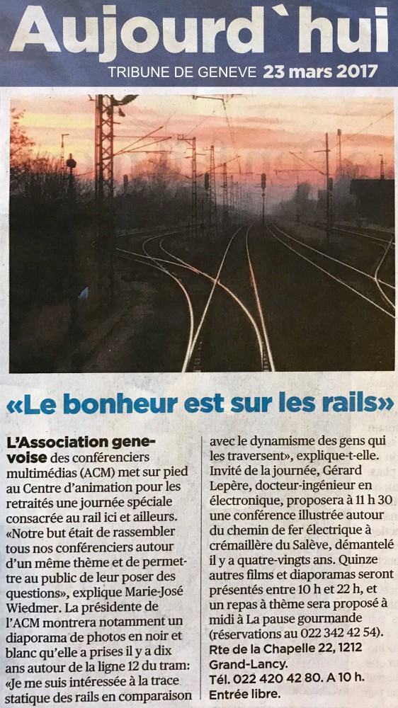 Être sur les rails, que ce soit en train, en tram, en funiculaire…c’est prendre le temps malgré les horaires; c’est croiser des gens de tout horizon dans les gares, les compartiments, aux arrêts; c’est quitter ceux qu’on aime sur le quai; c’est admirer des paysages traversés par aucune route, aucun sentier; c’est aller d’un lieu à l’autre, d’est en ouest… bref, c’est découvrir son soi intérieur!