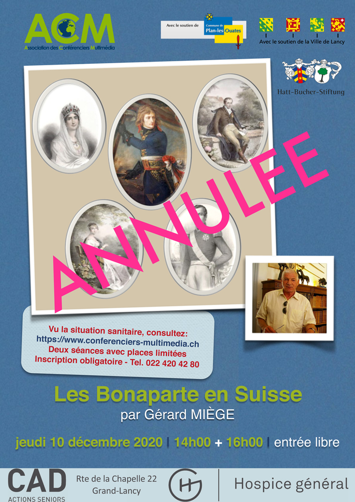Routes militaires, pays d’agrément ou lieu d’exil, la Suisse a été intimement liée au 19ème siècle aux destins de plusieurs membres de la famille Bonaparte. C’est sur leurs traces que Gérard Miège vous entraînera.