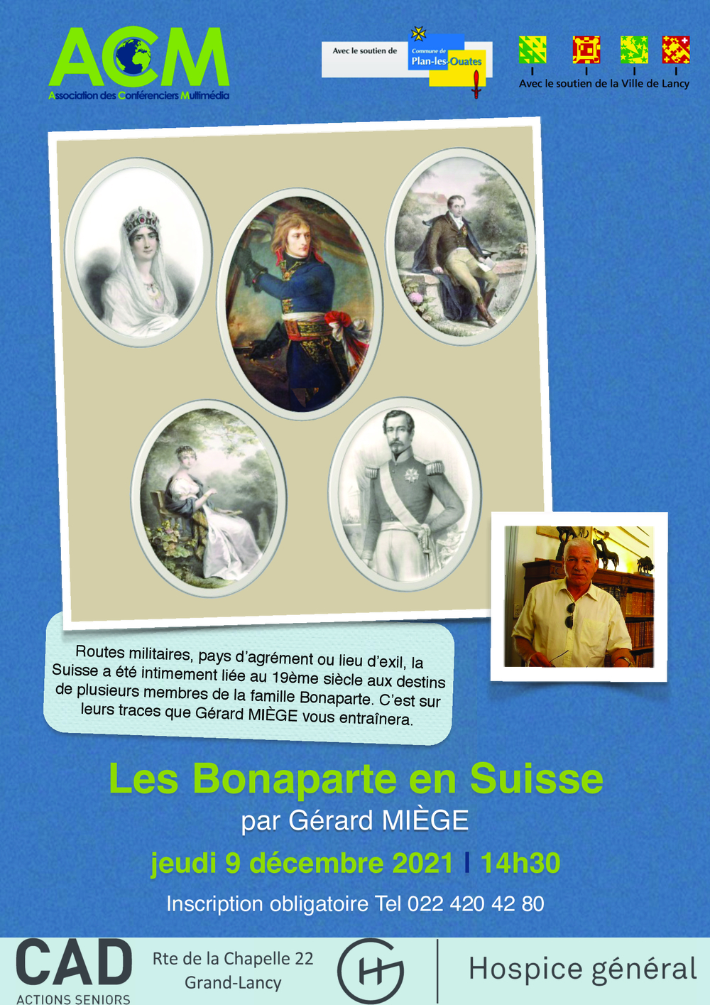 Routes militaires, pays d’agrément ou lieu d’exil, la Suisse a été intimement liée au 19ème siècle aux destins de plusieurs membres de la famille Bonaparte. C’est sur leurs traces que Gérard MIÈGE vous entraînera.