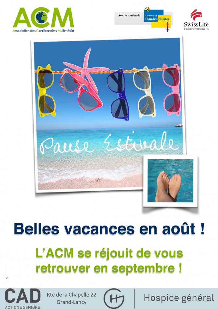 En août, les conférenciers de l'ACM sont en vacances et se réjouissent de vous retrouver en septembre 2019 pour de nouveaux exposés passionnants !