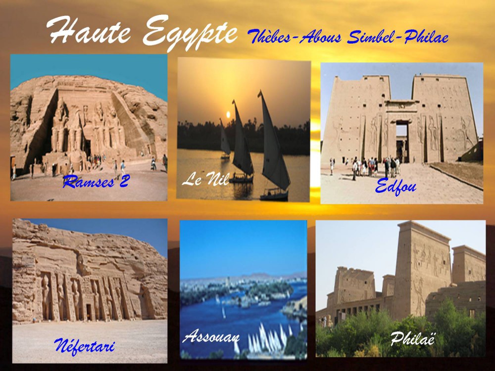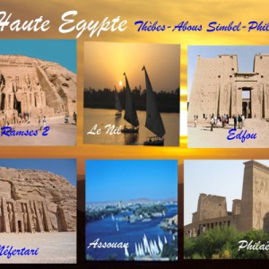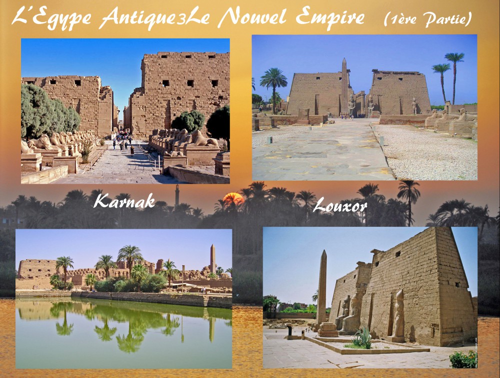 Le nouvel Empire est le 2ème âge d'or de l'Egypte antique (18ème, 19ème,20ème dynasties- Thèbes .(temples de karnak et de louxor), la vallée des Rois, et des Reines, le temple de Hatshepsout , les colosses de Memnon , Tell Amarna capitale de Pharaon Akhénaton et de Néfertiti, Esna temple de Khnoum , Edfou temple de Horus, Kom Ombo temple Sobek, Assouan ,mausolée de l'Agha Khan, île éléphantine , le jardin de Lord Kitchner ,Philae temple Isis, Abou Simbel Temples de Ramsès II et de Nefertit