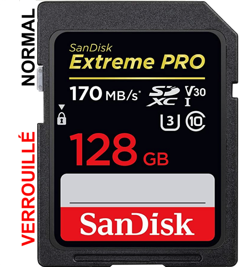 Les cartes SD ont un petit commutateur sur le côté gauche comme le montre le petit schéma. On peut voir un cadenas. Si vous poussez le clapet (qui est assez discret) à gauche vers le bas, votre carte passe en lecture seule (READ ONLY souvent noté "R/O"). Cela peut être pratique lorsque vous faites le transfert vers l'ordinateur.